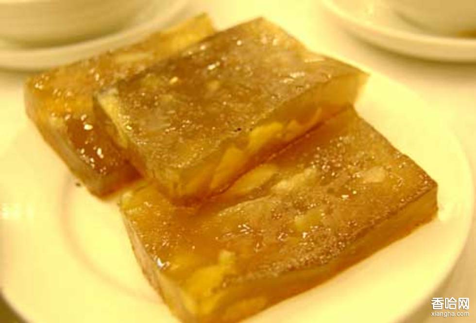 荸薺,粵語別稱馬蹄,故名。其色茶黃,呈半透明,可折而不裂,撅而不斷,軟、滑、爽、韌兼?zhèn)?,味極香甜。此品以廣州市泮溪酒家的為最有名。因其所處的泮壙是盛產(chǎn)馬蹄的地方。所產(chǎn)的馬蹄粉,粉質(zhì)細(xì)膩,結(jié)晶體大,味道香甜,可以做成多種點心、小吃。以它做成的馬蹄糕,是泮溪酒家的傳統(tǒng)名食,四季皆宜。