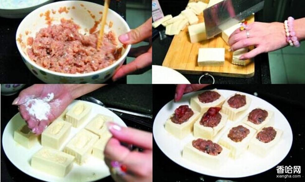 2、給豆腐塊挖洞要小心,別挖穿底部,釀入魚滑不宜過多,否則會將豆腐撐裂。