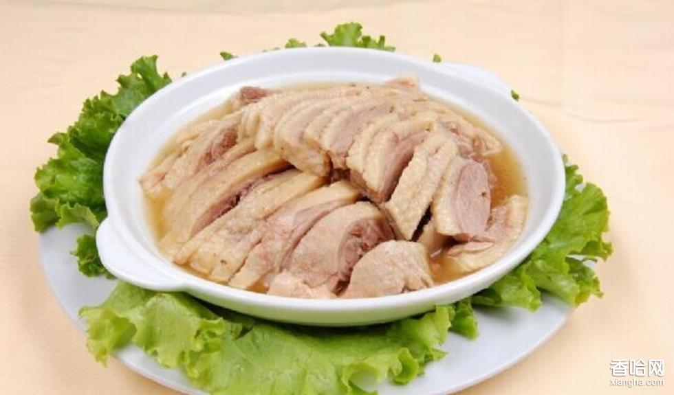 用1只重1千克左右的嫩鴨,宰殺后收拾干凈。將其放入一個(gè)大鍋里,倒入能淹沒(méi)鴨身的清水,同時(shí)放進(jìn)適量的、姜和黃酒,用大火燒開(kāi),撇去浮沫,再移至小火上燜煮10~20分鐘,加適量食鹽,鴨剛熟時(shí),馬上將鍋端下,蓋上鍋蓋靜置一旁,待鍋里的湯涼后,再將鴨撈出,控去湯汁,在鴨的周身涂上香油即可。