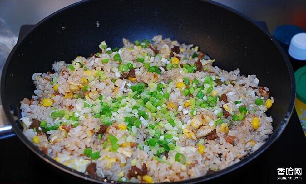 6繼續(xù)翻炒,這時(shí)要翻炒均勻,讓米飯和魚(yú)肉混合均勻,這樣才更入味更香,怕粘鍋,中途要適當(dāng)加一點(diǎn)點(diǎn)水進(jìn)去,然后加之前切好的小蔥進(jìn)去翻勻。