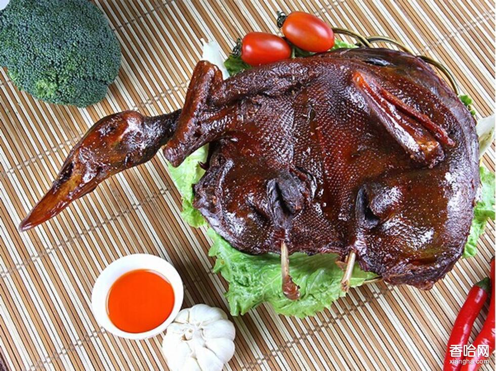 5.第三道工序就是烘烤。將鴨子反復(fù)熏烘至金黃色即可,在烘烤過程中揮發(fā)的除了水分還有絕大部分的鴨油,一邊烘烤一邊淋上剩下的鹵汁和辣椒油,這風(fēng)味便滲入骨髓中去了。臨吃時再裁成小塊裝盤。