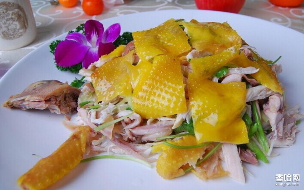 2、蒸雞冷后將雞皮撕下切成菱形小塊,雞肉撕成不規(guī)則粗條,再斬去雞頭、翅膀,裝入長腰盆,雞骨帶點余肉,全部斬成小塊墊盆底(沒帶肉的骨架不要),雞肉粗條拌上沙姜粉,原湯放在雞骨上,雞皮排在雞條面上,成原雞形狀,即可。