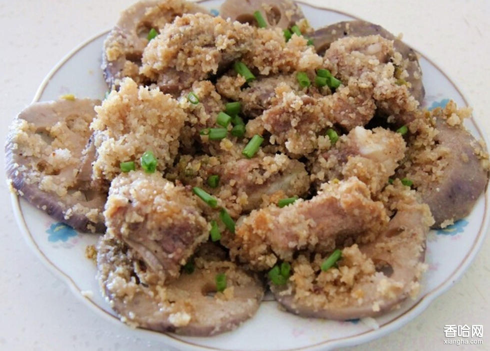 粉蒸蓮藕,漢族小吃,選用荷塘老藕為主料,此菜粘糊而不沾齒,油潤而不膩味。粉蒸蓮藕,選用荷塘老藕為主料,其制法為將藕刮洗干凈、去掉節(jié)的老藕分條剖開,然后把藕的剖面朝下,放在苫板上,用刀面拍破,切成一寸長,三分粗的條,盛入缽內(nèi),加姜末、精鹽、味精少許一起拌勻,腌漬片刻。切三兩肥肉丁拌入,再將腌漬好的藕,用生大米拌勻,放入籠屜內(nèi),用旺火蒸一刻鐘后取出,盛入盤內(nèi),澆鹵芡,淋香油,撒蔥花即成。