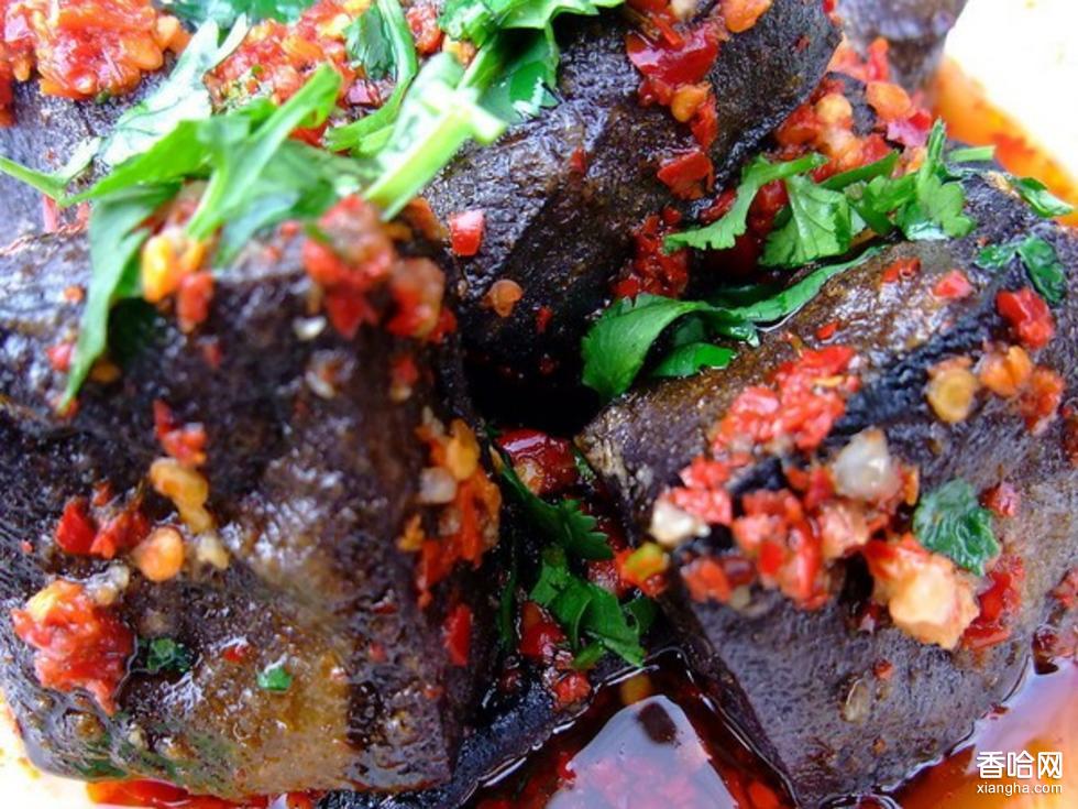 龍脂豬血,是指加工后的豬血特別嫩滑,有如龍肝風(fēng)脂一般美味。龍脂豬血用新鮮豬血味原料。制好的豬血輔以干椒末、冬排菜和芝麻油,味微辣而香脆,爽滑鮮嫩,十分可口。特別是在冬天,吃上一碗熱氣騰騰的豬血,能使周身暖和,五腑受用。