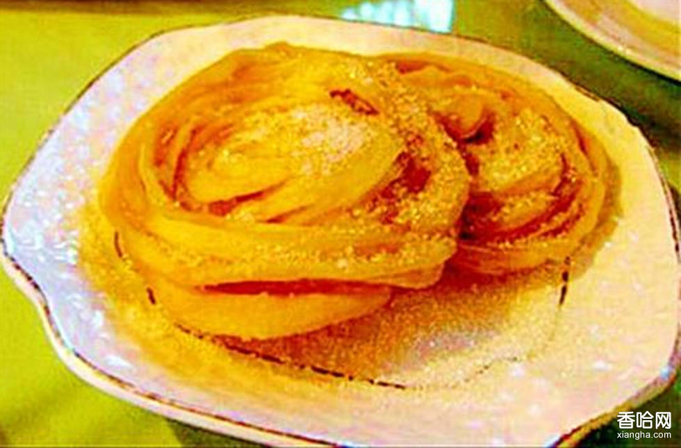 成重150克的面劑10個,搓成圓坨,擺放到盛有芝麻油(100克)的瓷盤里,餳10分鐘。2、案板上抹勻芝麻油,取出餳好的面坨,在案板上按成長方形薄面皮,從兩端向中間卷成雙筒狀,拉成約一半長條,再側(cè)著從兩端向中間卷成一個大、一個小的圓餅,將大圓餅放底層,小圓餅疊在上面,復(fù)放在盛芝麻油的瓷盤里浸沒,約餳5分鐘成餅坯。3、鍋置中火上,放人芝麻油燒到七成熱時,將餅坯平放鍋里,邊炸邊用筷子一夾一松地使餅坯松散,待餅坯炸至浮起時,翻面再炸,邊炸邊用筷子點(diǎn)動餅坯心,使餅炸至松泡但不能散開,呈金黃色時,撈出瀝去油,裝盤每餅撒上白糖(45克)即成。