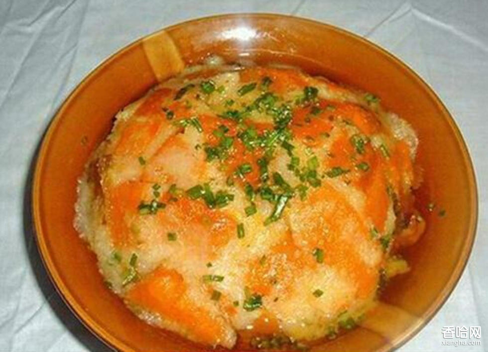 用料:南瓜一斤、珍珠米二兩、蔥三、四棵、甜面醬兩大匙、紅糖一匙、醬油兩大匙、醪糟汁兩大匙、五香粉一小匙、調(diào)和油三大匙、鹽適量。做法:1、鍋置小火上燒溫?zé)?,下珍珠米(如果用粘性小的米,那就加一點(diǎn)糯米)炒呈微黃色。2、盛出晾涼后放攪拌機(jī)攪碎成米粉。3、南瓜去皮去瓢后切約1.5厘米的方塊;蔥切碎。4、將鹽、醬油、紅糖、甜面醬、醪糟汁、蔥碎、五香粉、調(diào)和油同放一個碗里拌勻成味料。5、將南瓜塊放入味料拌勻,再放米粉拌勻,使南瓜塊裹上米粉。6、將裹上米粉的南瓜塊逐一排在碗里。7、放沸沒蒸鍋中用大火蒸約半小時。8、蒸軟后取出。9、在碗上蓋上盤子。10、將南瓜倒扣在盤子里,撒上蔥碎即可上桌。