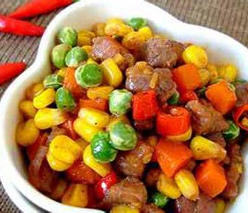 3、原鍋留少許油再燒熱,放入蔥花、姜末、蒜末爆香,然后加入牛肉丁炒至變色,放入胡蘿卜丁翻炒約3分鐘,再調入白糖、醋、醬油、鹽炒勻,用水淀粉勾芡,最后下入炸好的豌豆拌均勻,這樣就可以了。