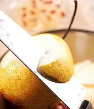 3、把梨也切塊,不用去皮,只要將梨外皮刷洗干凈就行。