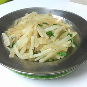5、蘿卜絲軟后加一勺鹽,撒點(diǎn)胡椒粉,味精即可裝盤。