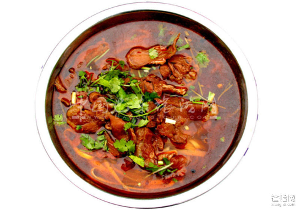 將羊肉剔骨,洗凈,切成銅錢(qián)厚的薄片,置鍋中煮至八成熟,成淡白色后撈起。再將干紅辣椒末(不能用辣椒粉)、姜末、大蒜末、花椒、豆瓣醬各適量放入?;i油、化羊油、香油各等份,炸成紅油,然后將八成熟的羊肉片倒入燴熟,置于文火之上待用。另將羊骨加八角、桂皮、茴香、陳皮等香料適量熬成湯,置于火上保溫待用。當(dāng)客人要食用時(shí),便將堿水面條煮熟撈起,盛于碗中,配上羊肉湯和羊肉臊子,放上一點(diǎn)芫荽即成。