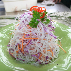 1、將青蘿卜洗凈去皮,切成細(xì)絲,用涼開水洗凈,瀝干水分裝盤。
