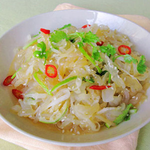 2、將青蘿卜絲加入精鹽、白糖、米醋、香油,拌勻即成。