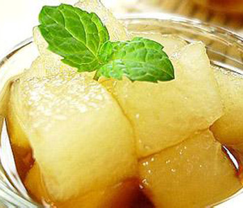 4、最后把梨塊和白蘿卜片一起放入鍋里,加入適量清水和冰糖煮20分鐘即可,取湯,果肉不要。