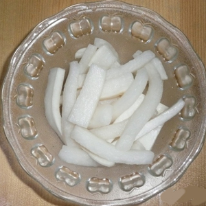 食材:白蘿卜一顆、胡蘿卜一顆、蘋果和梨各半個、蔥兩根、辣椒面、生姜、魚露。