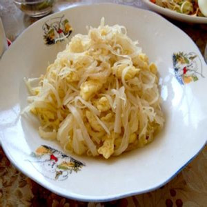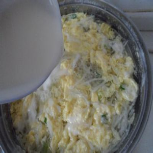3.攪勻的雞蛋液倒在攤開的蘿卜絲上,等凝結(jié)后翻炒,出鍋。