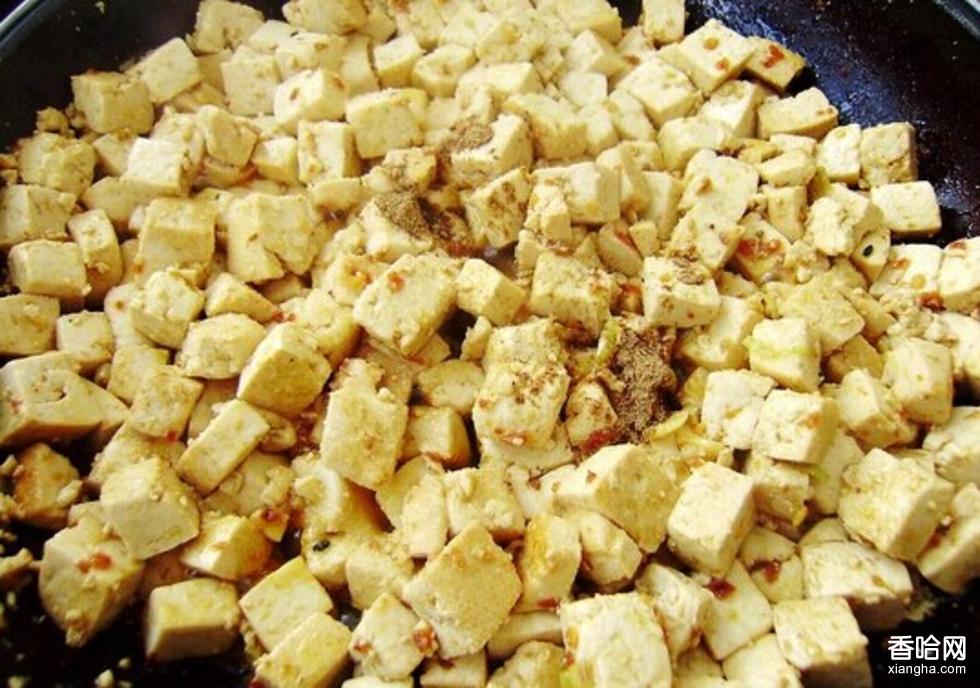 3、隨即將豆腐放在鍋中攪拌, 炒二三分鐘, 并用鐵勺不斷攪拌;