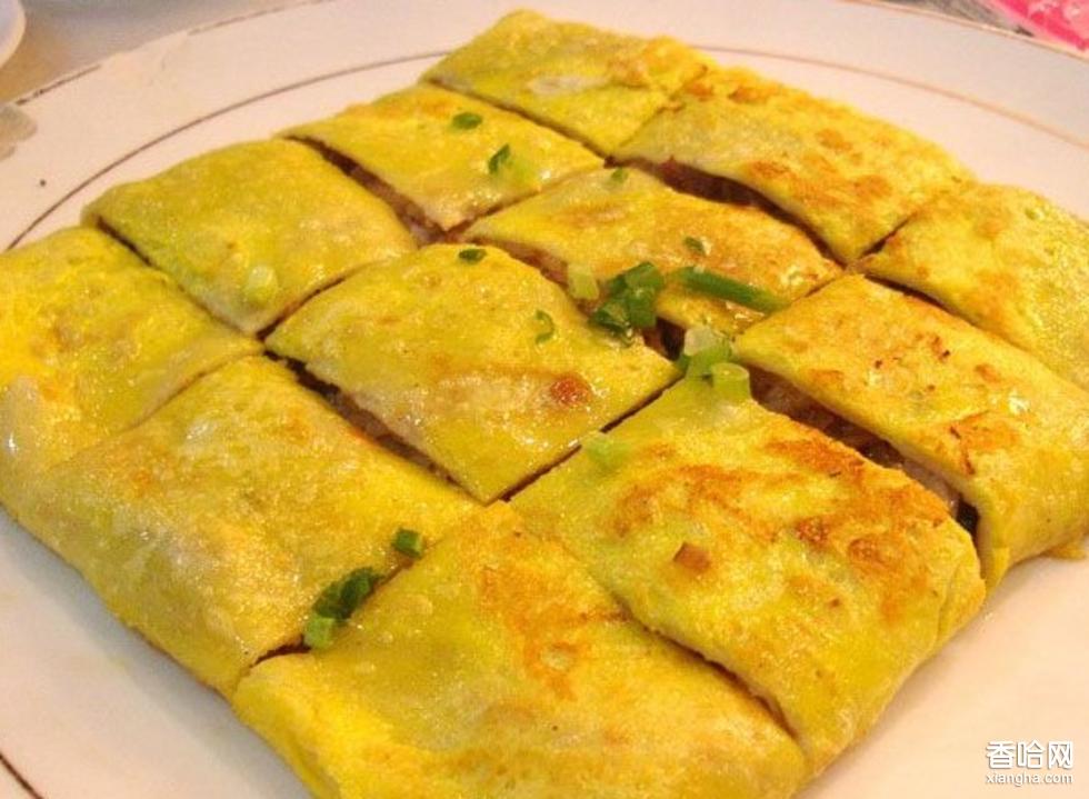 將綠豆、大米混合磨漿,在鍋里攤成薄皮,內(nèi)包煮熟的糯米、肉丁、鮮蛋、鮮蝦仁等餡料,用油煎制而成。其皮金黃發(fā)亮,入口酥松嫩香。