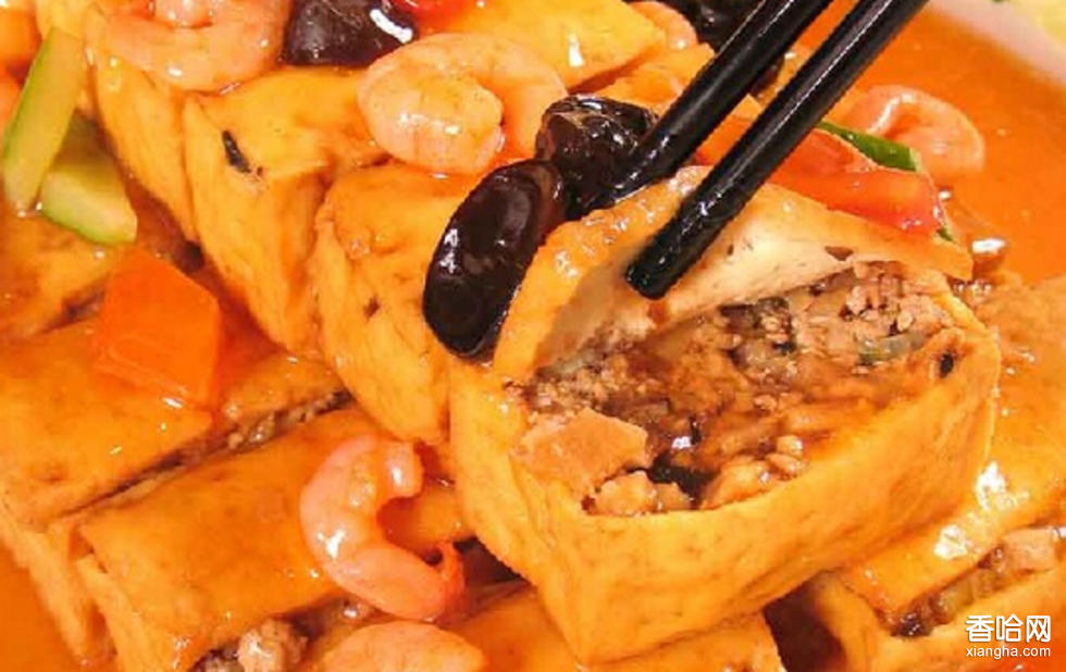 制作方法:制作豆腐箱是,先將豆腐切成六分方丁,寸二長(zhǎng)方塊,用花生油炸至金黃色撈出,再在豆腐塊的一面切開一塊皮(一側(cè)不切斷,起箱蓋作用),挖出內(nèi)里豆腐,再填上調(diào)好的餡料,蓋好“箱蓋”。餡料有多種多樣,有三鮮餡(海米、蝦仁、豬肉)、蟹黃餡、雞肉餡等。一般多用豬肉餡、什錦餡或素餡。豬肉餡制作方法是把海米、木耳用溫水泡好,把豬肉、海米、木耳、蔥、姜、肉分別切成末;炒鍋內(nèi)放花生油,燒開后投蔥、姜、肉煸炒至八成熟,加海米、木耳、鹽炒勻入盤內(nèi),加砂仁面或胡椒面拌勻,填入豆腐箱內(nèi),蓋好蓋放入盤內(nèi),垛成塔形,上籠蒸約5分鐘取出。另勺放香油,開后加蔥、姜、蒜末一煸,烹醋,投木耳、青菜、水筍和醬油、汁湯,湯開后勾芡,湯濃后澆在豆腐箱上即成。