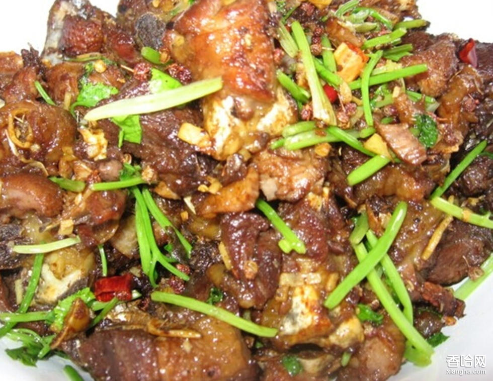 制法:1、土雞宰殺,除去內(nèi)臟,洗凈剁塊,香菜切段,辣椒、蔥切段,姜切片。 2、雞塊放入高壓鍋內(nèi)加水,上火壓8分鐘撈出,瀝干水分晾涼。 3、炒鍋上火,放底油,下入花椒、辣椒略炸,下入雞塊煸炒,下入蔥姜、香料粉,炒至啪啪作響時(shí),放醬油,撒上香菜段和三大勺味精翻勻,裝盤即可。 特點(diǎn):色澤紅潤(rùn),干香耐嚼,麻辣可口。