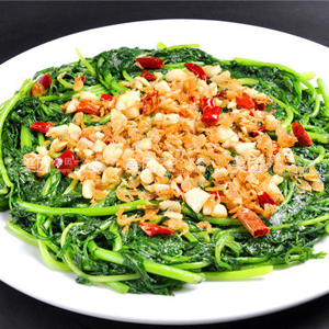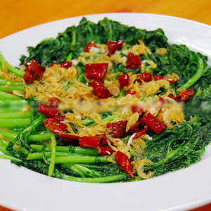 食材:蝦米100克、茼蒿300克、大蒜50克、干紅辣椒適量、精鹽適量、雞精適量、十三香少許。