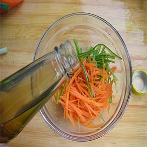 2、切蔥絲,姜絲,蒜片,與瀝干水的胡蘿卜絲放入容器,加適量的醋、鹽、調味品,可稍放一點糖,擱置幾天,就可以吃了。吃的時候亦淋上香油,與上面不同的是,這種方法腌制的胡蘿卜絲又多了爽口的脆,好吃。不過比較起來,沒有第一種能放的時間長哦。