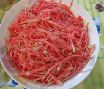 媽網(wǎng)提醒:若要腌制其它口味的胡蘿卜,則要將已腌制好的咸胡蘿卜進行浸泡,以利于去除過多的咸味,一般情況下泡制半天,其中要換兩次水,即可達到微微咸味的狀態(tài)。這時便可進行其它口味的腌制了。