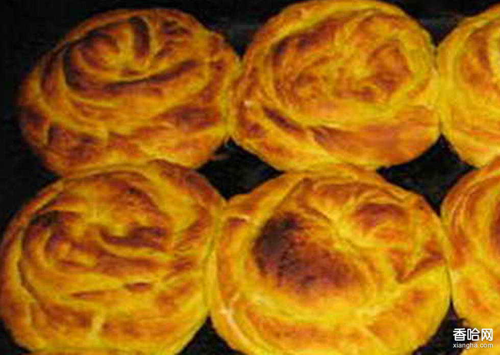 2、把面塊分成每塊重約600g的面劑,推搟成直徑約22cm,厚3cm的圓形餅,上鏊勤翻轉(zhuǎn),俗稱“三翻六轉(zhuǎn)”,烙得火均勻,皮色微鼓時即熟,周圍并有菊花形的毛邊。