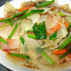 2、炒鍋置火上,放油燒熱,放入花椒炸黑撈出棄去,加入白蘿卜條煸炒,加入雞湯少量,翻炒至七成熟,加入茼蒿段煸炒,加精鹽、味精調(diào)味。