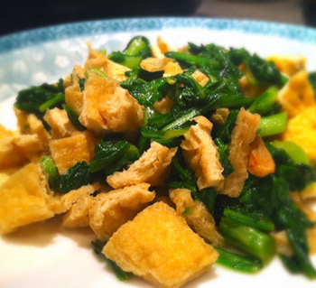 點評:口感膩滑的炸豆腐與柔嫩鮮脆的茼蒿一道放入口中,品味到的是兩種截然不同的味道,給人感覺十分奇特。
