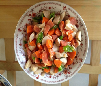 主料:豬肉80g、胡蘿卜100g、杏鮑菇200g