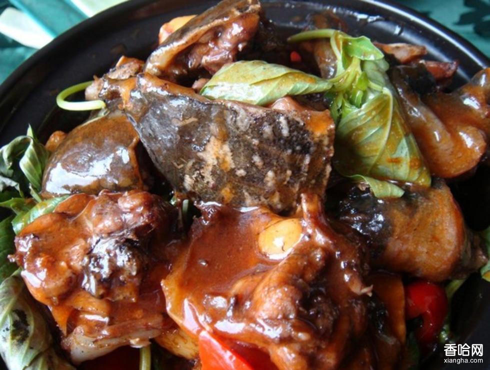 先將甲魚斬去頭,放入沸水鍋內(nèi)燙片刻撈出,用清水刮凈白膜和粘液,用刀沿魚背殼四周剖開,取出內(nèi)臟洗凈,剁成2.5厘米見方的塊。然后將腳魚盛入砂缽內(nèi),放入豬油、醬油、甜酒娘、蔥結(jié)、姜塊,加蓋用旺火燒沸后,移置小火上,燜至酥爛,然后上旺火收稠鹵汗取出蔥結(jié)、姜塊,放入味精,撒上椒粉,淋上麻油裝盤即成。特點(diǎn):味香濃醇,原汁原味。