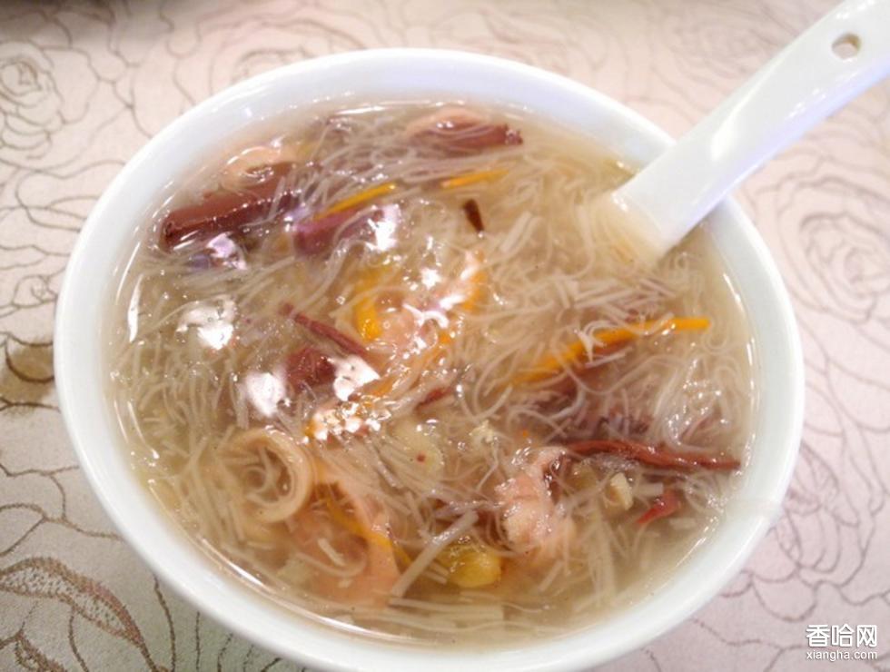 2、鍋置旺火上,倒入豬骨湯和用蝦糠煮過的湯汁,澆沸。將精制面線稍捻碎放入沸湯鍋中,加入精鹽、味精調(diào)準(zhǔn)味。淀粉調(diào)水徐徐舀入鍋中,并不停推勺至面線浮起,鍋中湯汁成糊狀即可。
