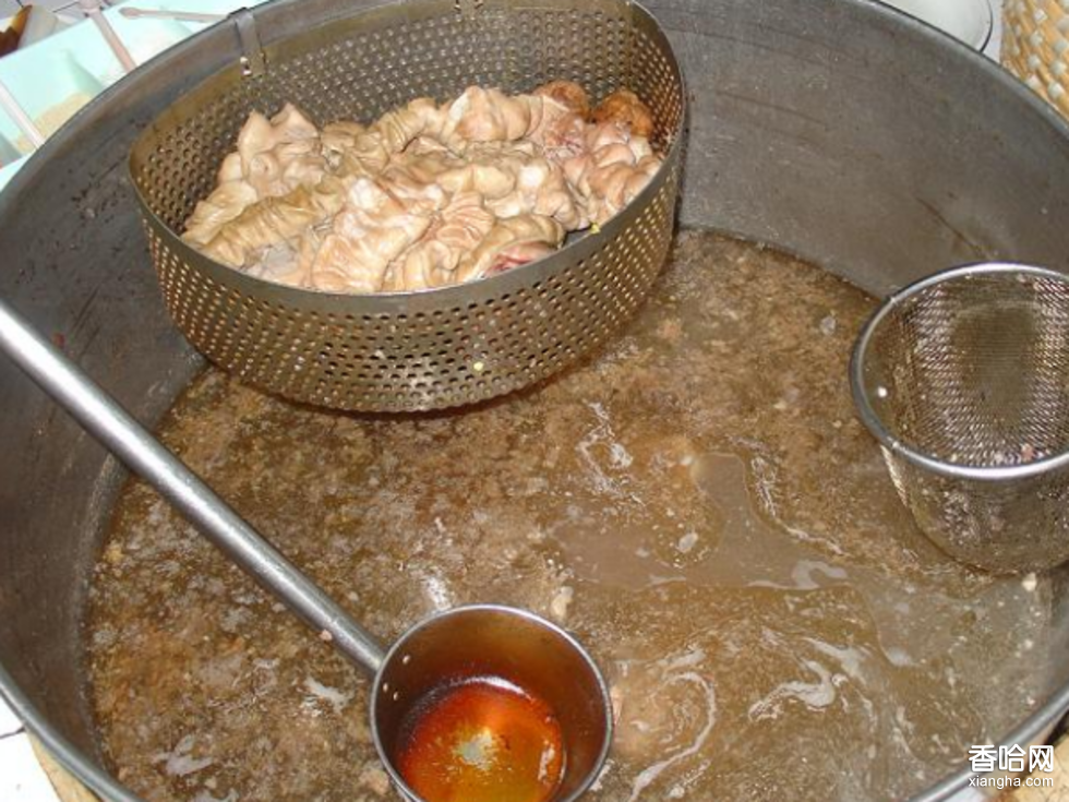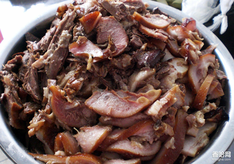 制作時,先用細(xì)鹽輕搓幾遍,然后放入原湯鍋中,煮兩小時左右,煮時放入用紗袋包好的豆蔻、砂仁、肉桂、八角、茴香等佐料。煮熟的肉撈出,放在鍋內(nèi)箅子上,加糖熏烤即成。