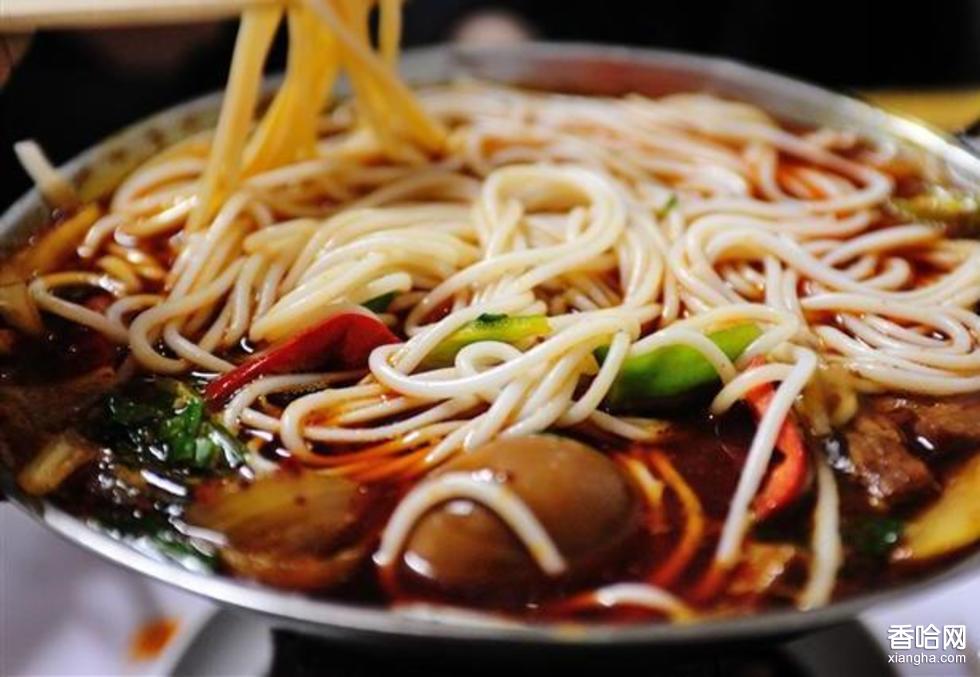 2.漏床(或壓饸饹機(jī))放入沸水鍋上,把粉團(tuán)放進(jìn)漏床槽內(nèi),壓成細(xì)條落入沸水鍋中,隨落隨用竹筷挑動(dòng),待米粉條全部漂起后撈出。先用清水沖洗,再放冷水缸中冷卻即成。若將醬油、紫菜、姜汁、青蒜末少許撒放碗中,澆入高湯,隨即將米粉用沸水燙過,盛入碗內(nèi),即成高湯米粉。若將芝麻醬用涼開水調(diào)稀、放入適當(dāng)?shù)木}和醋,澆在米粉上,再撒上咸香椿芽末、咸胡蘿卜末、黃瓜絲,即成麻汁米粉。在高湯米粉內(nèi)放肘子時(shí),即是肘子米粉。