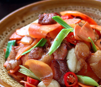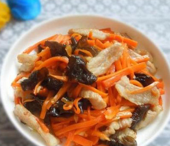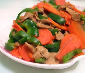 主料:胡蘿卜300g、柿子椒50g、紅椒50g、黑木耳50g、豬肉200g