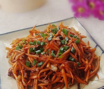 1)將胡蘿卜切成絲,將肉洗凈放入冰箱冷凍室冰凍兩小時后取出(這樣切出的肉絲快捷又漂亮), 將凍過的肉切成肉絲;