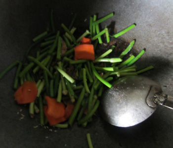 3)再加入胡蘿卜絲快速翻炒,至胡蘿卜變熟后,加少許食鹽調(diào)味即可出鍋。