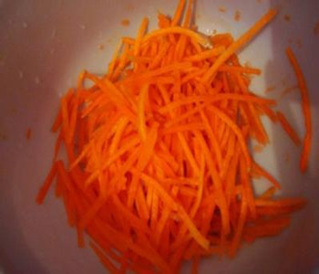 1、將胡蘿卜洗凈后切絲。不要食用切碎后水洗或久浸泡于水中的蘿卜。