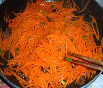 5、加鹽繼續(xù)煸炒至胡蘿卜絲變軟出紅油盛出。