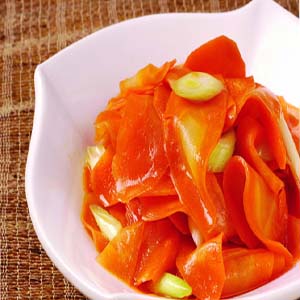 炒胡蘿卜片外觀色彩油紅,口感咸鮮味香。還具有明目、調(diào)理便秘的功效。