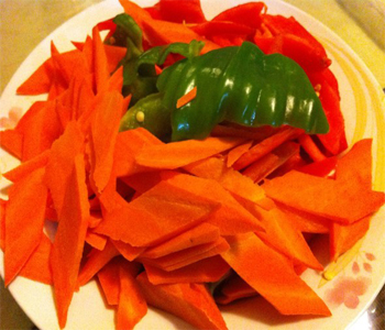 1、辣椒、胡蘿卜、姜蔥切好;