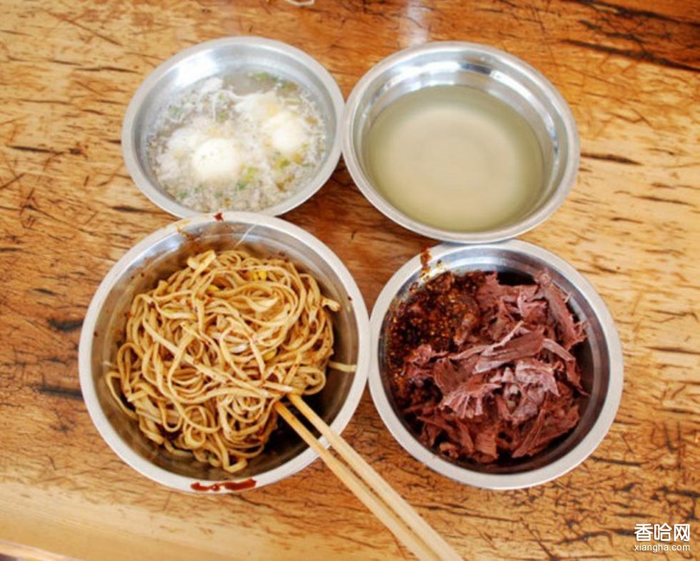 4.煮好的豆芽湯撈起部分豆芽,鋪在放好調料的碗里。上面再放上煮好的面條,然后,上面一定要加辣椒油。