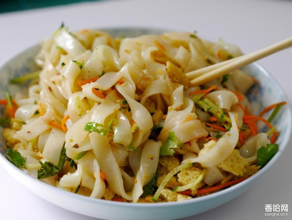 將綠豆、高粱、豌豆、山芋等加工成淀粉(可混合用,也可單獨用),調成稀糊,用大鍋加水燒開,用器皿取淀粉50克左右,放入特制的銅鏇內(形似平底鍋),將鏇子放入沸水上轉動,然后慢慢停止,淀粉糊在鏇子內攤成薄薄的一層,然后鏇子內放入沸水,迅速撈出放入涼水內,用手慢慢將薄淀粉皮從鏇子內扒掉,放在特制的高粱稈或葦子做成的簾子上晾干即可。