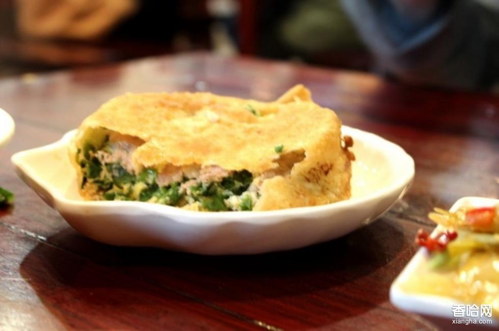 一只豬油、瘦肉、豆腐和蔥餡的油煎餅中,灌入一只打碎調味的雞蛋,熟后各餡結成整體,入口醇香鮮美,深受食客們的喜愛。