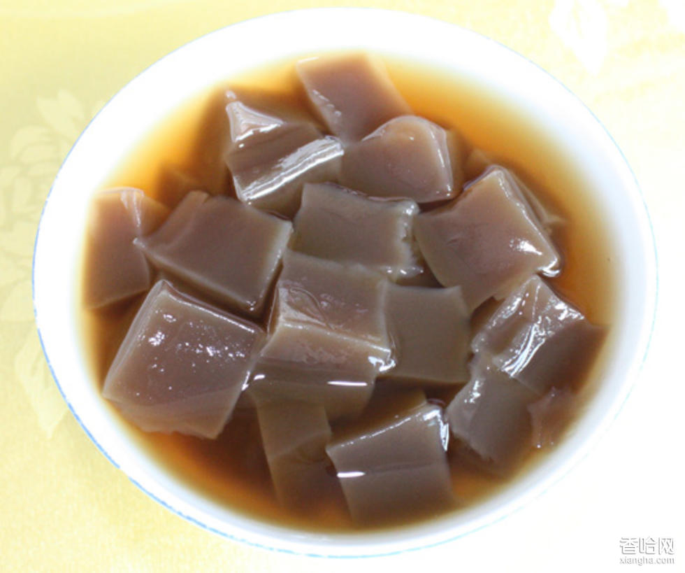 4.成形。燒好后,趁熱盛到備好的容器中。待自然冷卻后,用刀劃成小立方塊,然后放入涼開水中浸泡。