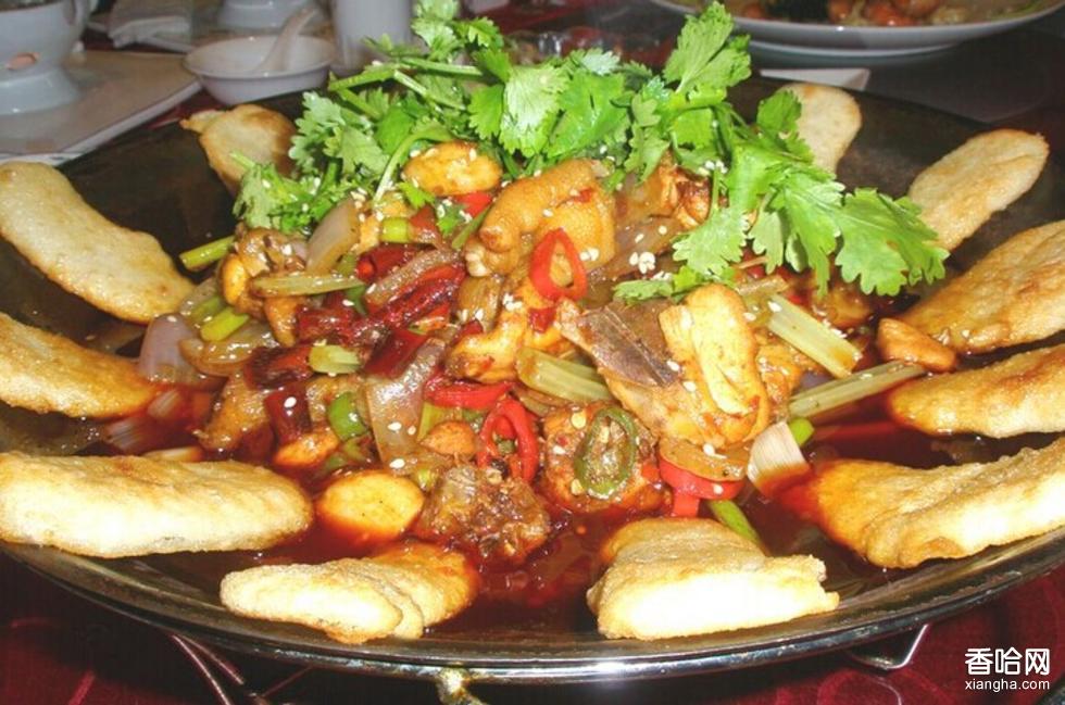 三、制作過程另鍋放油燒熱,爆香姜片、蒜仔、八角、花椒,倒入雞塊,烹入料酒,煸炒至水分將干時(shí),添入高湯,加蓋燜至湯汁濃稠、雞塊熟時(shí),下入青紅椒,調(diào)入精鹽、味精、雞精、鮮辣味粉、美極鮮醬油,稍后再下少許老抽調(diào)色并起鍋盛入面餅鍋中,隨配酒精爐(或小土爐)上桌即成。