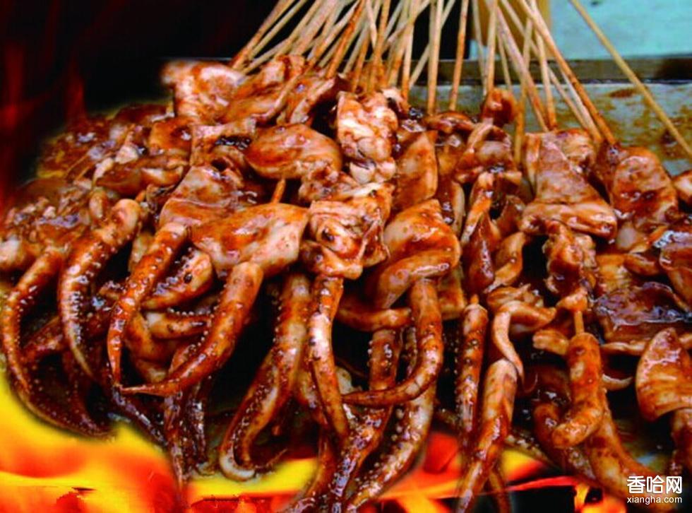 將鐵板置于火爐上燒熱,用排刷在鐵板上均勻地刷上一層植物油,將洋蔥切成均勻的小顆粒狀放入鐵板上炸出香味,將穿好的魷魚串置于鐵板上進(jìn)行烤制,在烤制過程中應(yīng)時(shí)刻注意調(diào)節(jié)火力的大小,并不斷地刷油、翻面、以免烤糊,在烤制過程中應(yīng)在魷魚表面撤匕適量五香粉、孜然粉、辣椒粉、花椒粉烤制好后的魷魚表面刷上一層飄香醬后即可食用。
