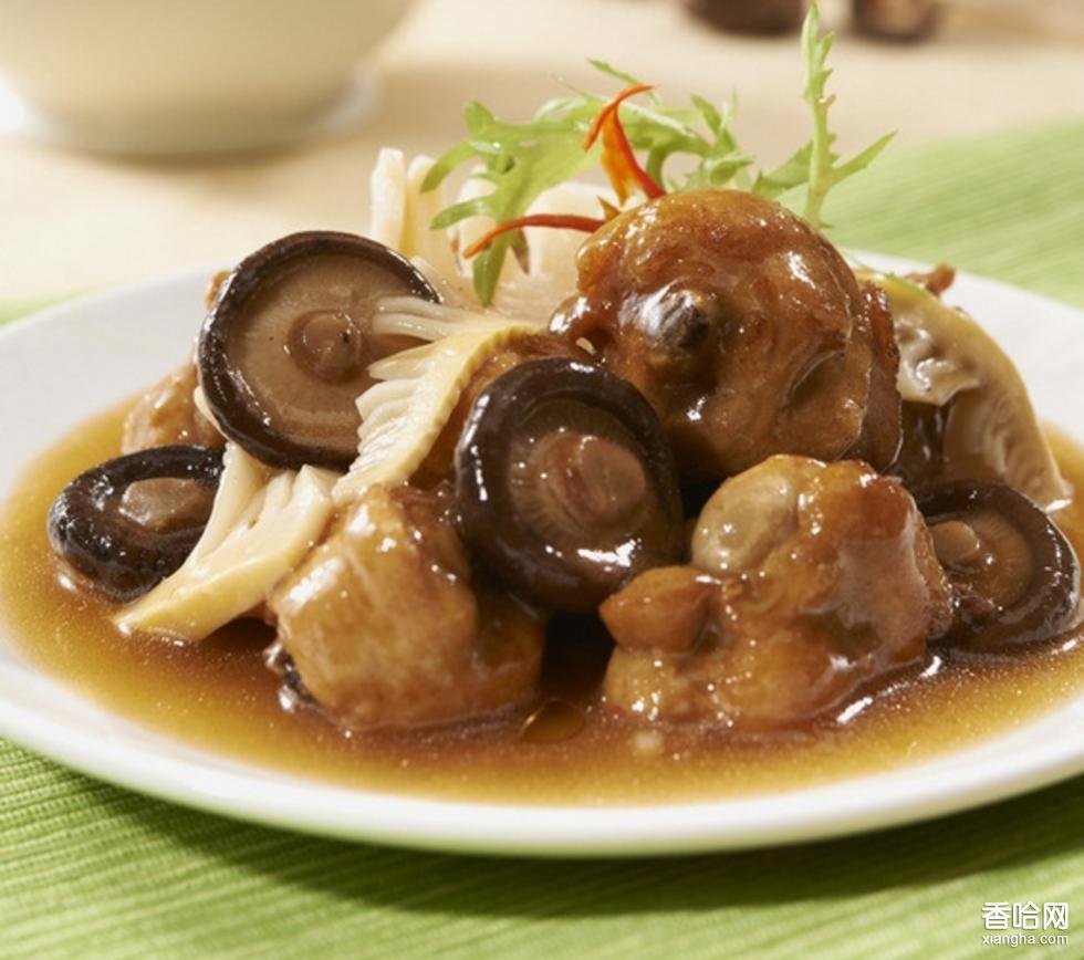 (2)口蘑泡開洗凈切成片,加蔥、姜放入雞塊拌勻。然后扣上碗,上籠蒸40分鐘,取出扣在盤內(nèi)。