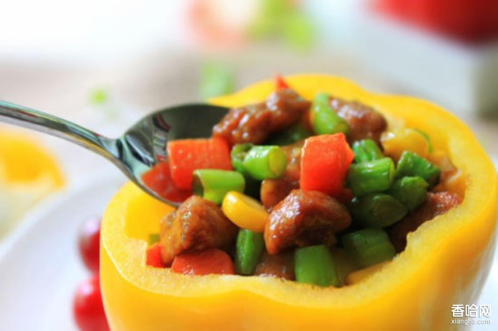 原料:豬肉脊肉150克,鮮辣椒50克,青豆50克,香菇50克。