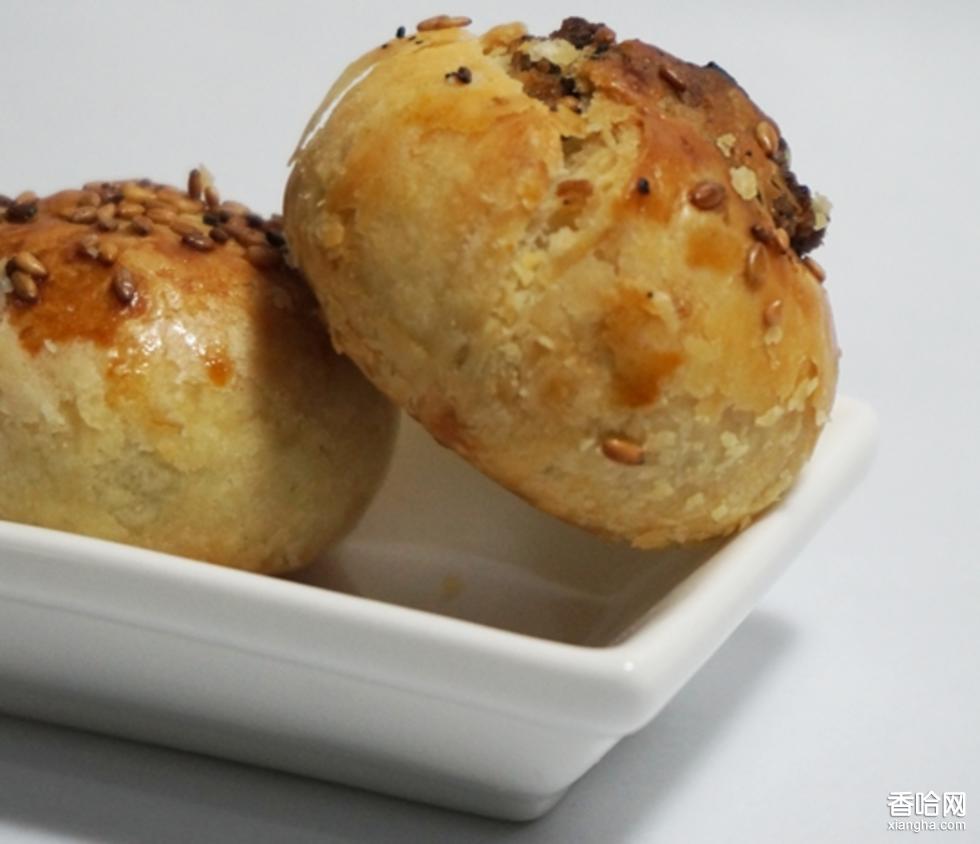 5.成型:把包好油酥的餅皮,用手掌撳薄,再包入餡料,收好口,用手稍稍輕壓,做成半圓形餅坯,餅底戳3個洞,面上敷一小撮芝麻,然后刷蛋起光。刷蛋后應(yīng)迅速進(jìn)爐烘烤。